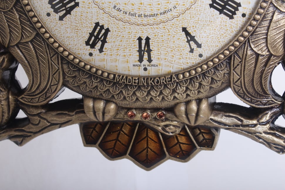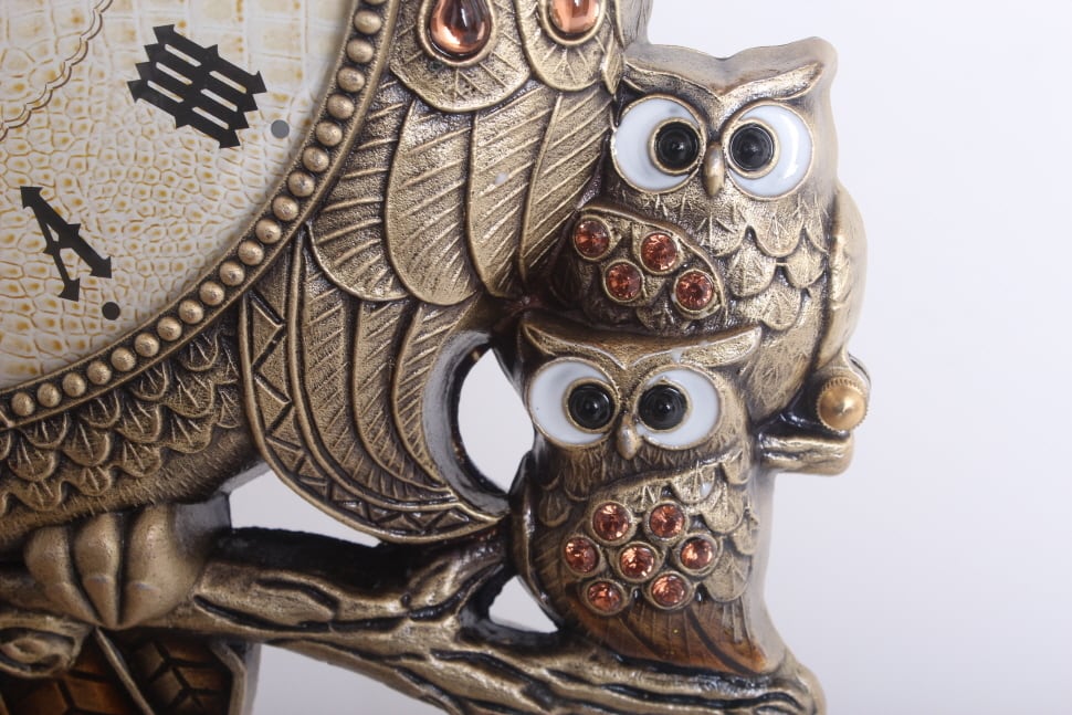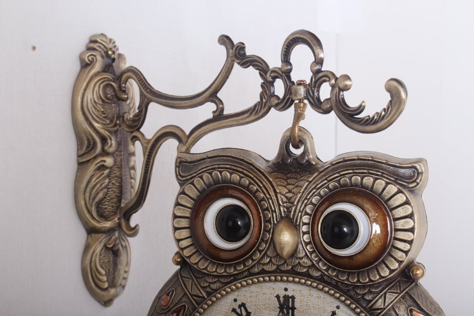 幸運や知恵を象徴するフクロウをモチーフにしたアンティーク調の両面掛け時計です。真鍮素材の本体に、繊細なエポキシ加工やキュービック装飾を施し、クラシックかつエレガントな空間を演出します。